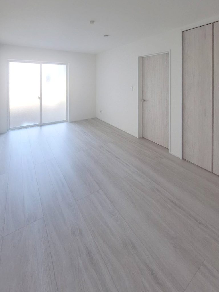 明るい陽光がたっぷり差し込むリビングは、柔らかな色合いのフローリングと白を基調とした内装が調和し、広がりのある開放的な空間を演出しています。キッチンとつながる一体型レイアウトで、ご家族の会話が自然と生まれる心地よい暮らしを実現。シンプルで洗練されたデザインは、どんな家具とも相性が良く、自分らしいインテリアを楽しめます。日常をゆったりと過ごすのにぴったりの、優しい雰囲気のリビングです。