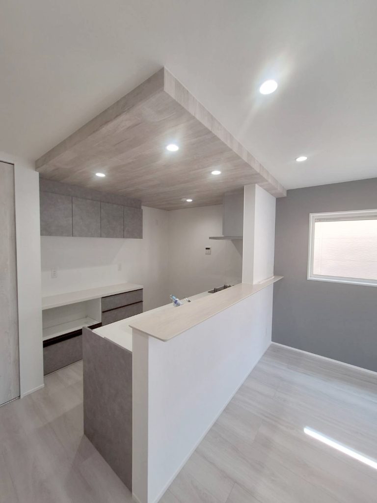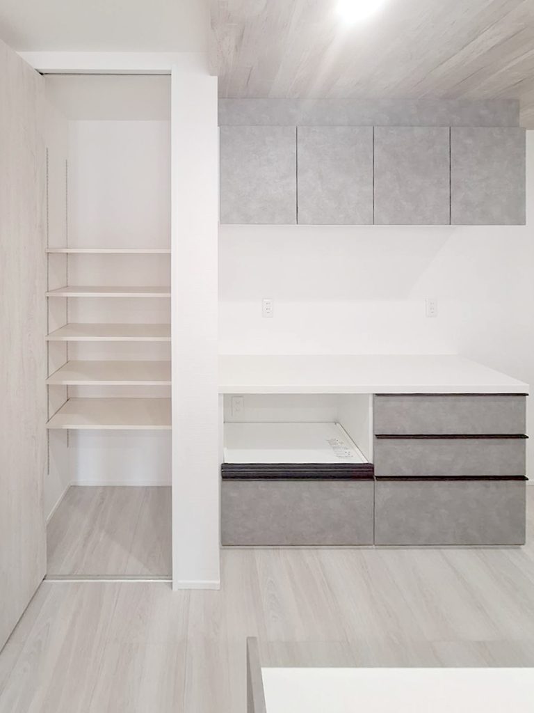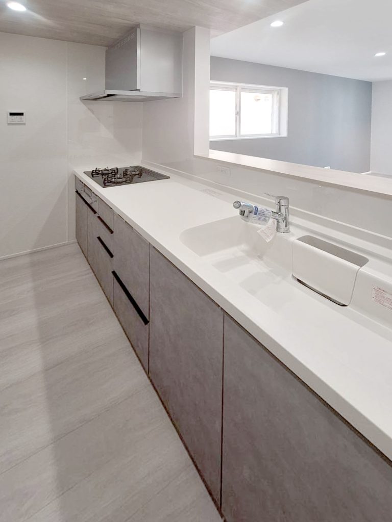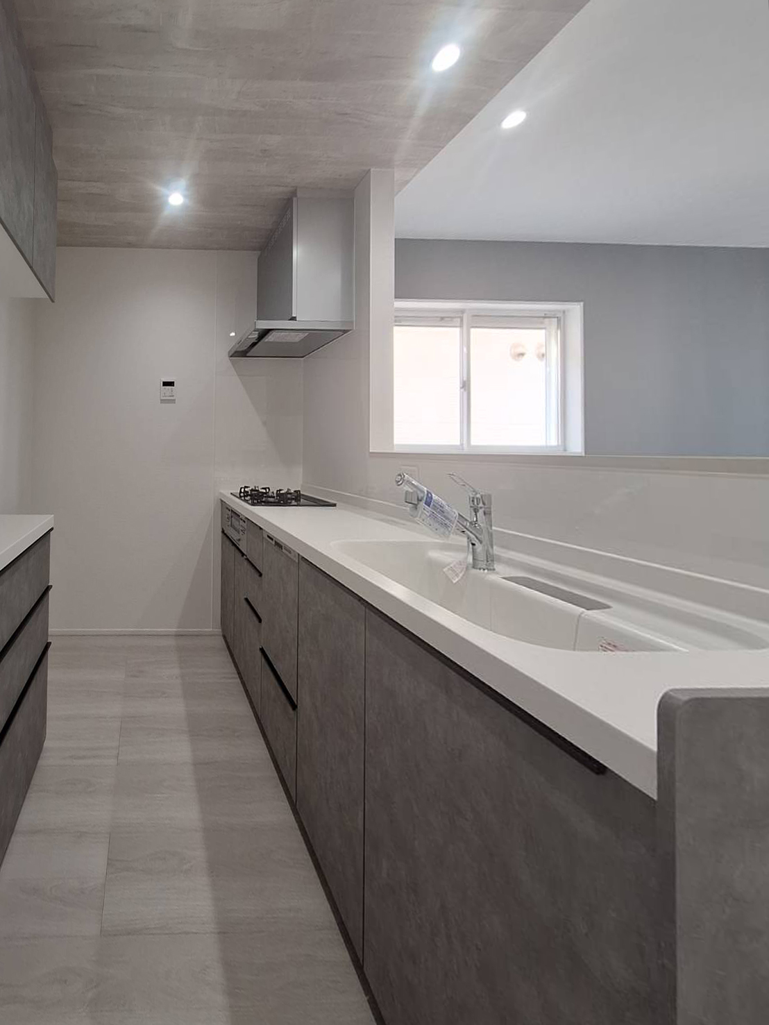 スタイリッシュなグレー調でまとめられたキッチンは、落ち着きと高級感を兼ね備えた空間です。ワイドなカウンターは料理がしやすく、シンク横の作業スペースも広々。収納も上下にたっぷり確保されており、キッチン周りをすっきり保てます。リビングを見渡せる対面式で、家族とのコミュニケーションも自然に生まれる設計。機能性とデザイン性を両立した、毎日の料理が楽しみになるキッチンです。