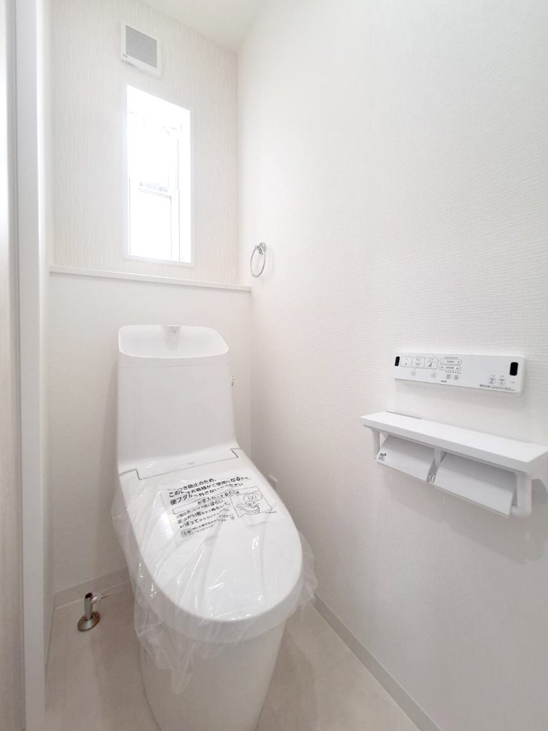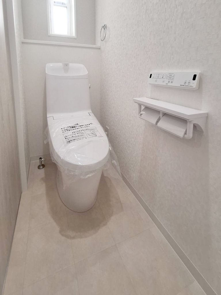 デザイン性と機能性を兼ね備えたトイレは、快適な毎日をサポートします。落ち着きのあるアクセントクロスと高級感のある床材を採用し、清潔感あふれるスタイリッシュな空間に仕上げました。