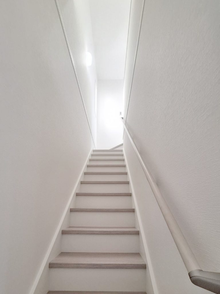 柔らかな木目調のデザインが印象的な階段は、ナチュラルで温かみのある空間を演出します。ホワイトを基調とした内装との調和が美しく、清潔感と上品さを兼ね備えています。